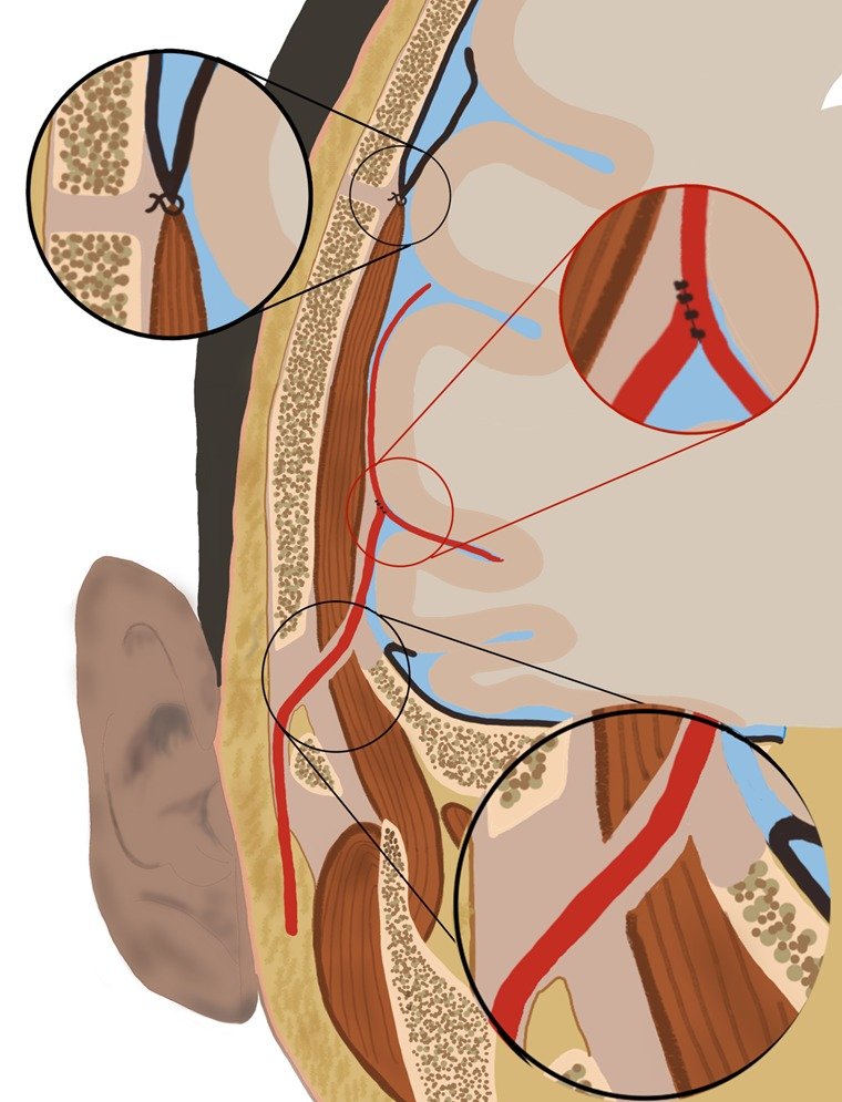 A tiny blood vessel from the scalp is harvested and surgically connected to a blood vessel in the brain. This surgery allows blood to bypass the obstruction in the internal carotid artery and reach the brain. This technically demanding surgery is always done in combination with the indirect revascularization surgery (below).